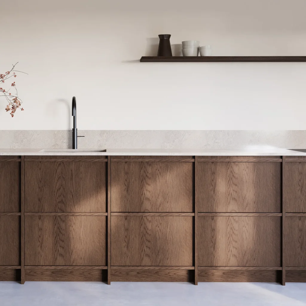 Door deze combinatie ontstaat een architectonisch ritme met diepte en schaduw, zonder drukte of overdaad. De keuken krijgt een rustige maar krachtige uitstraling, met aandacht voor vlakverdeling en materiaal.